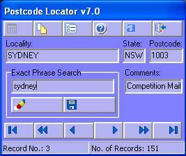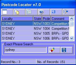 Postcode LocatorPostcode Locator can be used to quickly locate Australian postcodes, and paste them into your document.It sits in the system tray when not in use. It has 3 search modes.